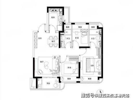 双卫设计是这款户型的一大亮点,两个卫生间均为明卫,干湿分离,既解决了早高峰抢卫生间的尴尬,又保证了居住的卫生与舒适。5 飘窗 + 1 阳台的设计,大幅增加了室内的使用面积与采光面,让每一个空间都能享受阳光与美景。对于预算有限、追求实用性的刚需家庭来说,这款户型无疑是最佳选择,总价仅 298 万起,轻松实现三房梦想。