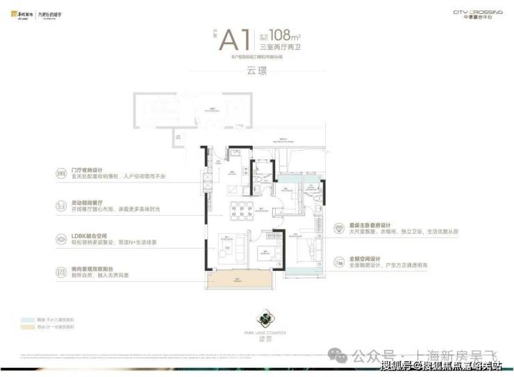 108㎡三房两厅两卫:三开间朝南, 中環置地中心望云售楼处电话:400-8894-986 面宽9.6米,客厅带4.2米阳台;U型厨房,主卧套房设计。空间利用率高,布局合理。