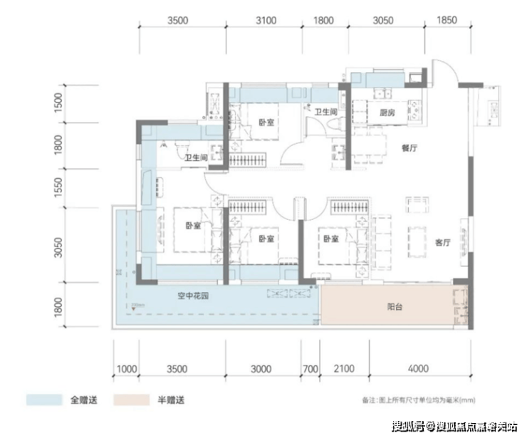 二是全赠送入户花园(空中花园)+半赠送阳台+全赠送花池。