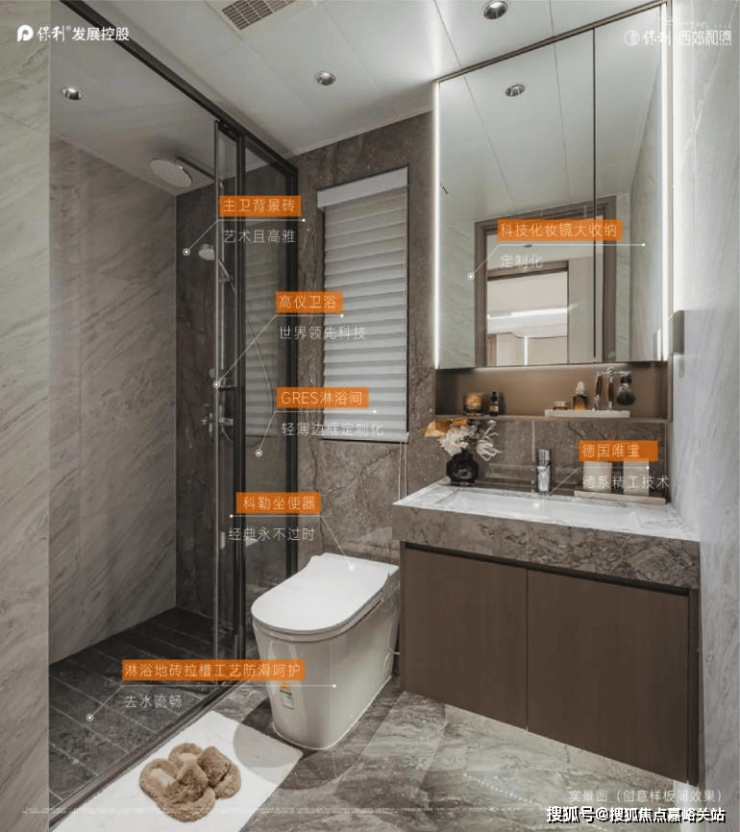 卫生间浴室配备品质4件套,同时置物架/镜柜/去水槽等匠心设计,也将卫浴间的精致拉满。