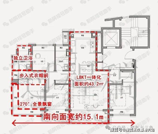 1、空间革新:四开间朝南,南向面宽高达约15.1m,采光面充足,景观视野开阔!LDKB一体化设计尺度奢阔!面积达约43.2㎡!超广阳台采光及通风效果MAX!年轻父母用嵌入式烤箱准备Brunch,老人在阳台晒太阳听鸟叫,孩子趴在腿边畅想未来