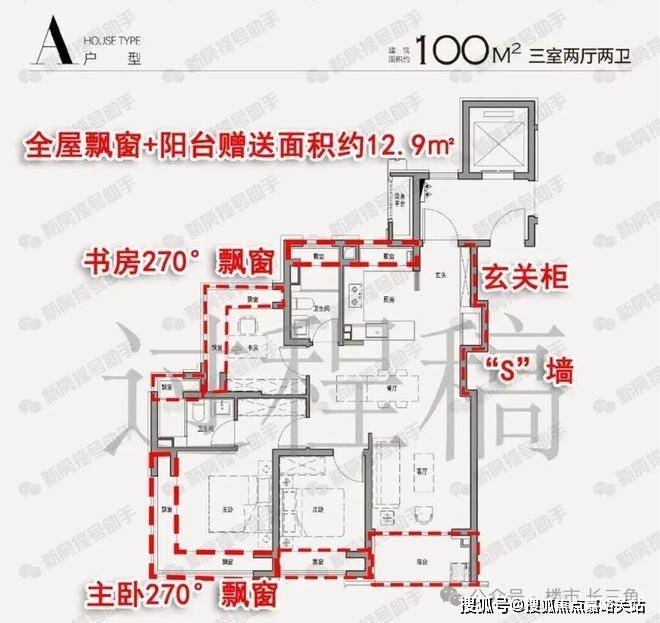3、空间升级:超配双270°飘窗格局!市面上很少会有主卧及书房均设计270°飘窗的百平户型,稀缺性不言而喻~