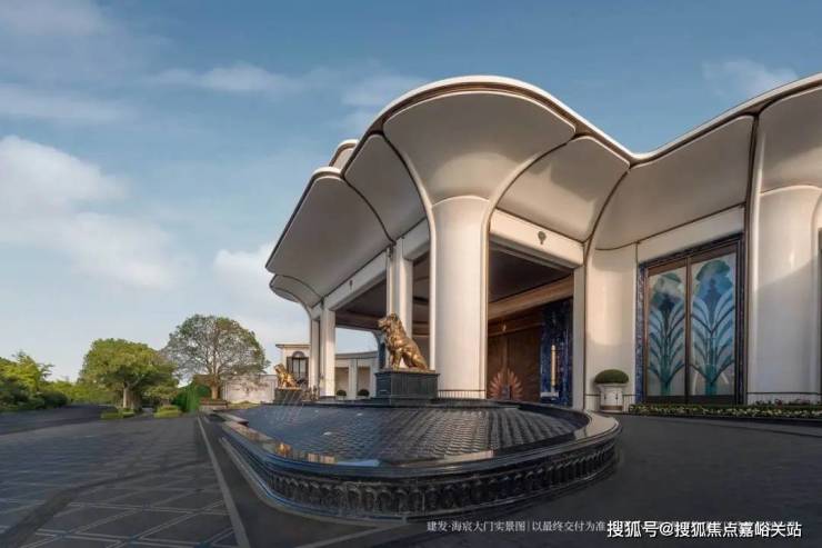 约65米环抱式落客前场 ,灵感来源于 “上海豫园-湖心亭九曲桥” , 双尊威严铜狮 静立, 双株名贵金桂 伫立,环抱一汪 “尊华瑞鳞” 水景,寓意流水生财,奠定尊奢门仪。
