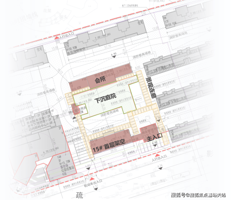 位置放在了南北两栋楼中央,从南侧主入口进入后,还需要比较长的步行距离才能达到下沉庭院,与现在常见的主入口直接连着会所的形式不太一样。
