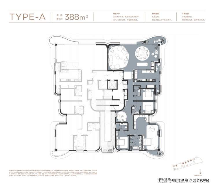 这个户型与建面约240㎡的产品相同,都是三梯三户的设计,出电梯后就是宽敞的 入户门厅空间。