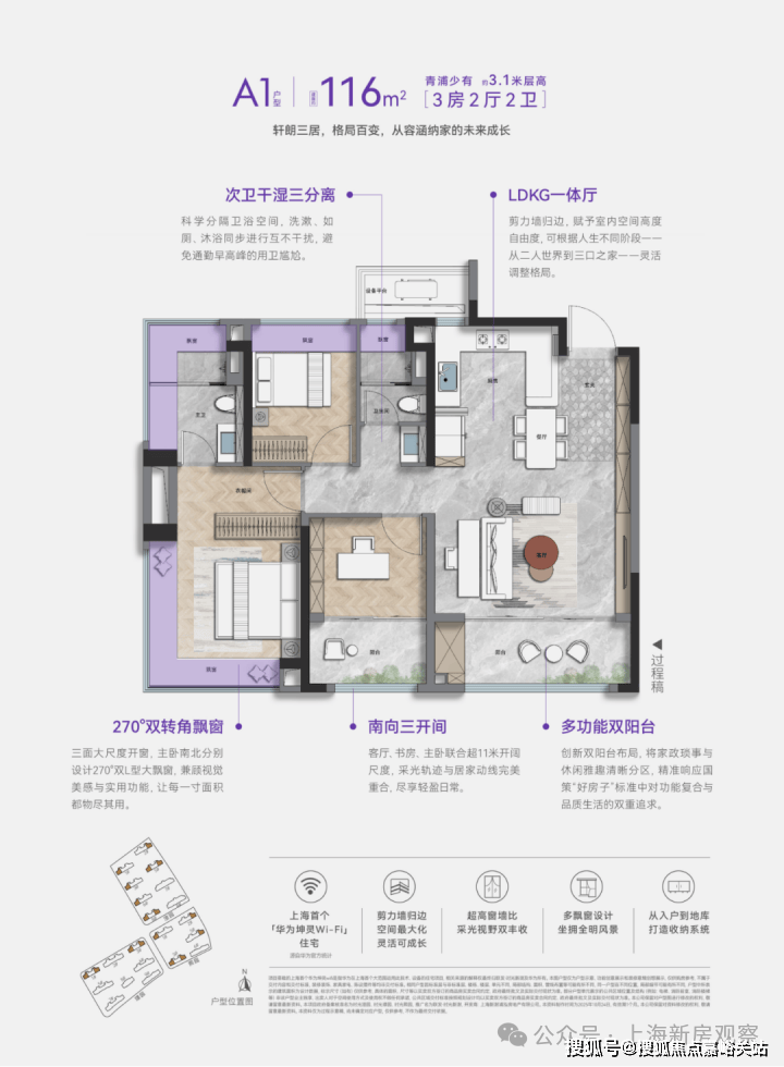 动静分区+大横厅, 朝南面宽达到约10.85米,客厅开间约4.8米,层高3.1米,空间尺度感非常好,适合年轻夫妻和幸福的一家三口居住。
