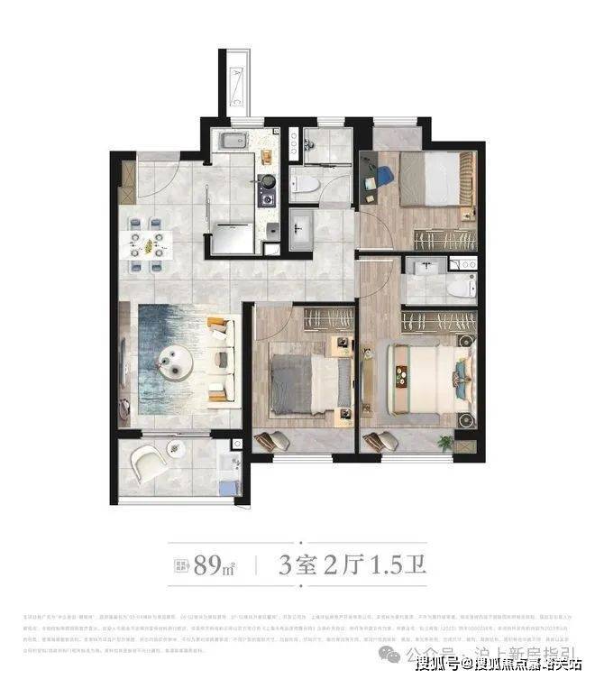 [ B户型 ] 建筑面积约89㎡ | 3房2厅1.5卫