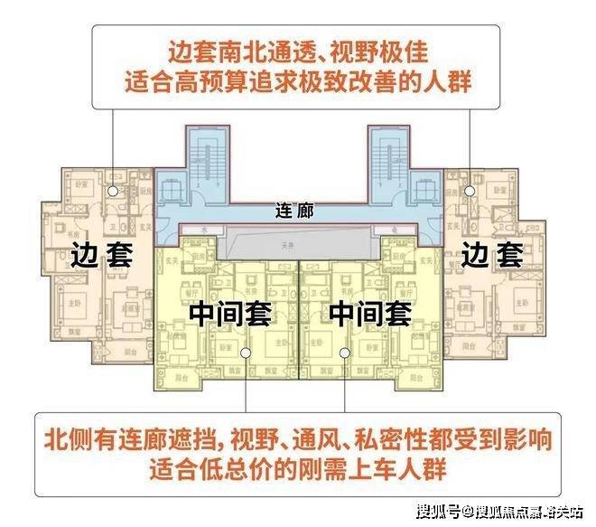要知道,市面上9成的新房都是两梯四户,这意味着中间套的北侧就是连廊,采光、视野、通风效果很差,自然中间套就卖不上价格。