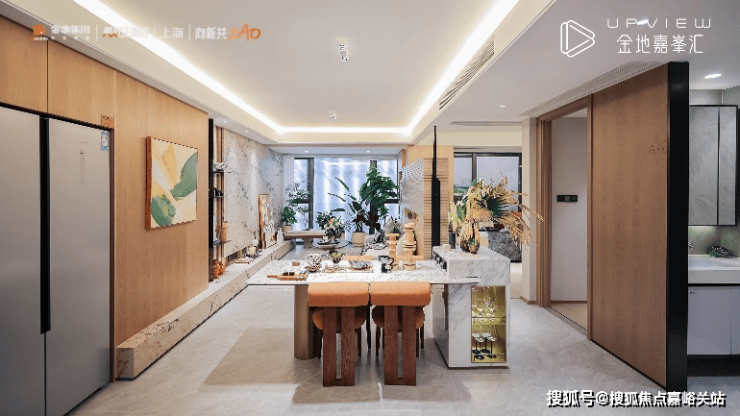 LDKB一体化设计。通过金属玻璃移门和岛台联动, 🚣🏻🚣🏻金地嘉峯汇售楼处电话:400-8894-986✨✨达成餐厨一体,增加家庭成员互动。烟道外置以及S墙内嵌设计,优化空间布局,提升台面使用感和转角柜使用频率。
