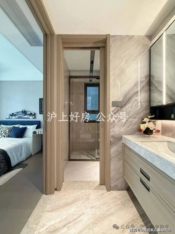 双大堂系统则将尊崇感贯穿于归家动线的每一程。社区主入口大堂以酒店式的空间尺度与艺术化陈设,完成从城市到社区的过渡;单元入户大堂则进一步将仪式感升华,精选雪山飞狐、高山流水等珍稀奢石作为主背景,天然形成的山水纹理宛如艺术画卷。搭配精心设计的艺术吊灯与金属细节,营造出兼具归家温馨感与艺术馆般精致度的“第二客厅”。从公共到私属,双重大堂不仅实现了功能分区,更通过材质与光影的层层递进,完成了情绪上的铺垫与升华。
