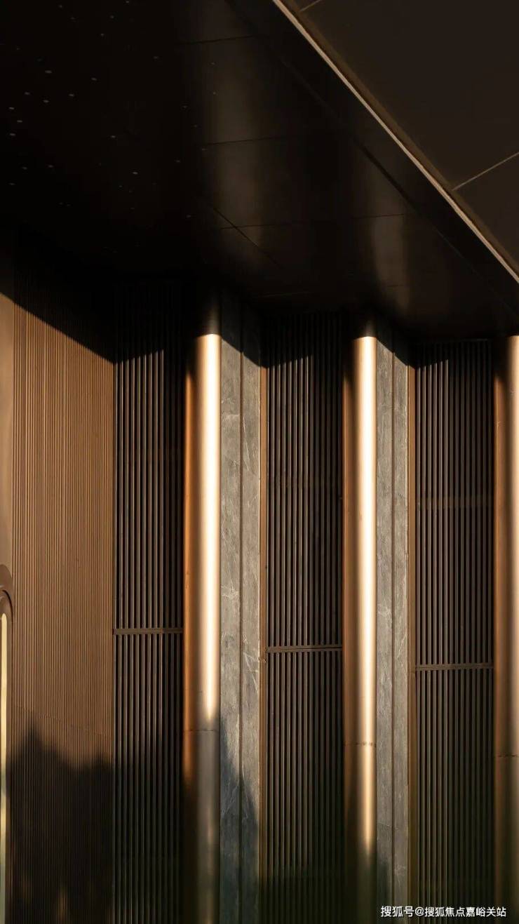 项目北区的社区归家主入口,景墙取自“水”和“鱼”的元素,诗意静谧、南区入口归家大堂,联动地下采光会所;