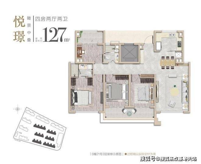 这个四房虽然建面只有127㎡,但因为是5层叠墅的高得房率,同悦湾璟庭售楼处电话:400-8824-258