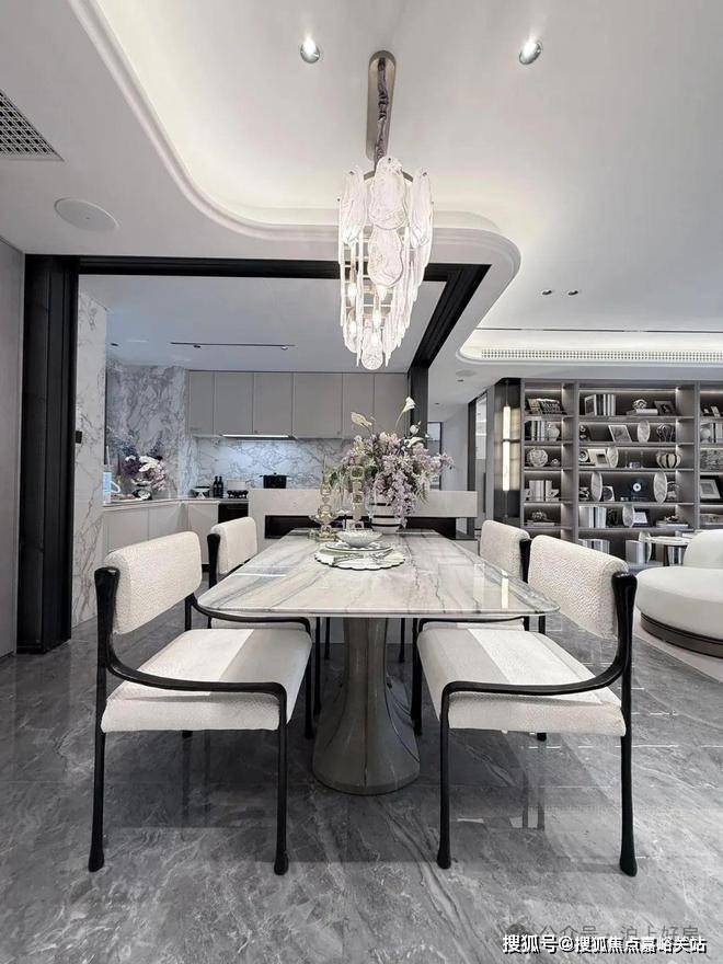 进门之后,恍若走进一幅立体绽放的画卷。地面采用了石材拼花,纹理如行云流水般舒展,在光影交错间勾勒出低调的奢华。