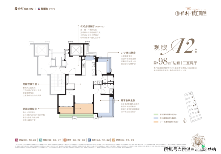 约98㎡3房:类一梯一户、全屋飘窗为标配,双阳台+花池是核心亮点(市面双阳台户型起步多为约110㎡),整体附赠约23㎡,是罕见的高实得率精致户型。