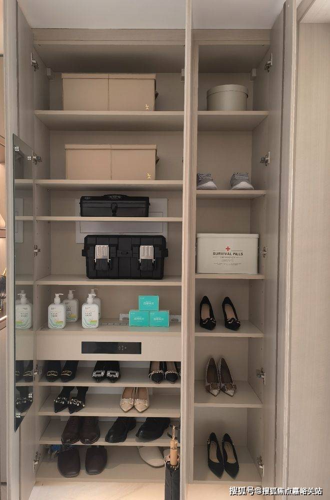 玄关收纳:定制橱柜,全部用环保等级E0板材打造,规划多个空间格子,方便各种鞋子、包包、靴子、随手物品轻松放置。