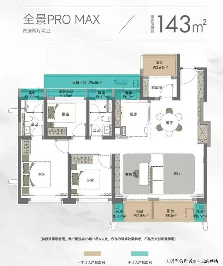 以105㎡的户型为例, “三阳台”搭配花池的设计 ,直接性价比拉满,按照规定: 阳台计一半面积,花池不计面积 ,加上 主卧+卫生间还带飘窗 (主卧飘窗非承重结构),如此算下来,对购房者而言,日常可以实打实 利用到的面积是远超市面上其他三房产品。