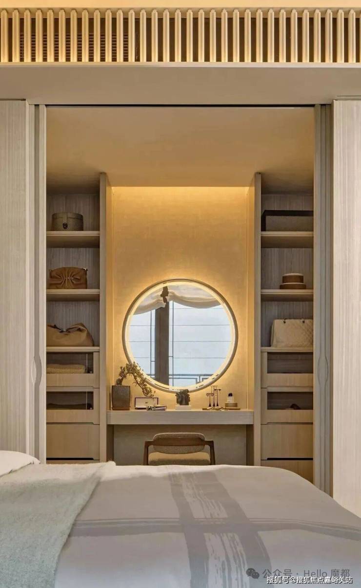 三楼顶层专属于主卧,整体以米白色调为主,加入了少许鲜亮橘色。拱形天花设计尽显浪漫,空间挑高3.8M,一条长灯带自浴室贯穿至整个卧室区。分置于灯带两侧的弧形结构环抱出一份安心,为空间增添温暖包裹的氛围。双衣帽间的配置更显奢华