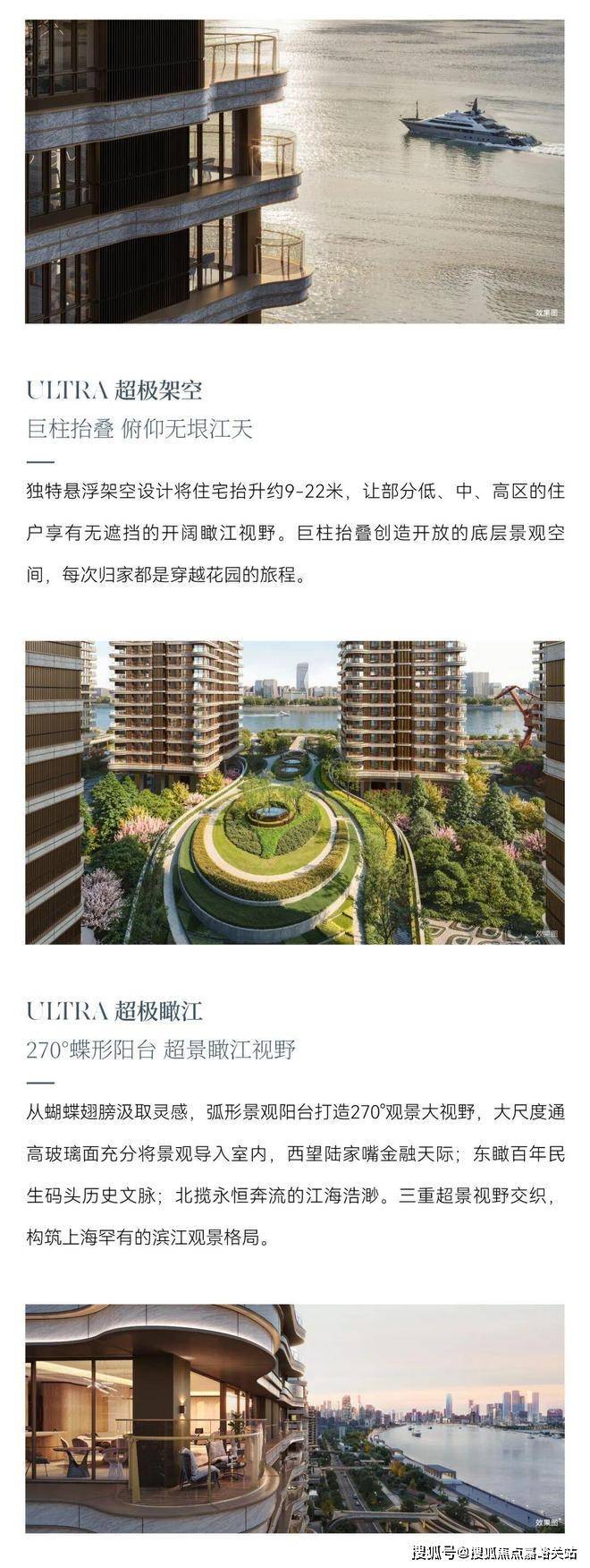 3.创新设计:约9-22米悬浮架空设计,9座空中连廊直达滨江;弧形蝶翼建筑+全落地玻璃窗,270°IMAX环幕视野