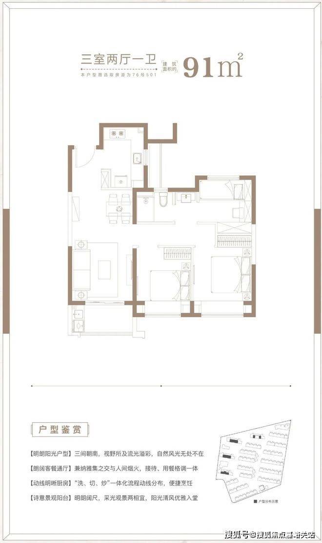 大华梧桐樾售楼处预约电话:400-8824-198建面约91㎡3房2厅1卫户型,做到了三开间朝南+双朝南卧室带飘窗+动静分离+卫生间干湿分离,采光面拉到极致的小3房户型。