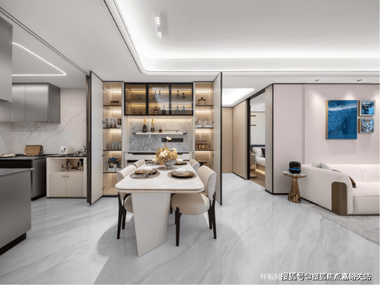 超30㎡餐客方厅采用一体化布局,巧妙地连接南向阳台、U型厨房,形成极佳通风采光通道。轻松容纳6人餐桌,无论是三代同堂的日常用餐,还是周末的家庭聚会,都能从容应对。