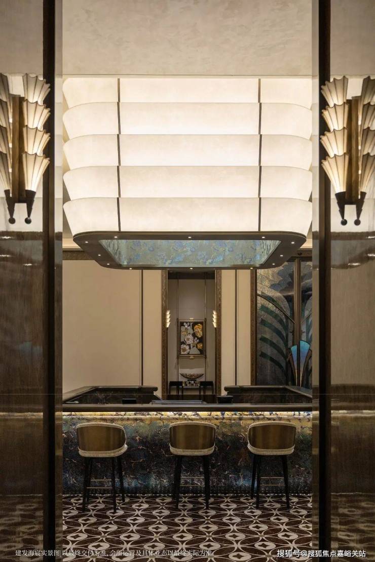 以玉兰门庭—迎归大堂—莳花荟为主轴,敬献步履生辉的归家艺旅:玉兰门庭如繁花盛绽,尊华瑞鳞水景聚运生财,双尊铜狮镇守家宅;迎归大堂流转光影艺韵,百羽栖澜艺术雕塑、芦海宸韵非遗绣作流淌摩登气韵;莳花荟中央会客厅移步异景,献映会客、休闲等雅会。