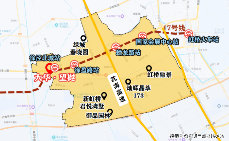 交通方面: 项目北侧紧邻17号线徐泾北城站(需绕行河道),1站可达徐盈路天空万科广场,2站至蟠龙古镇商业区,3站直达国家会展中心,4站即达虹桥枢纽。