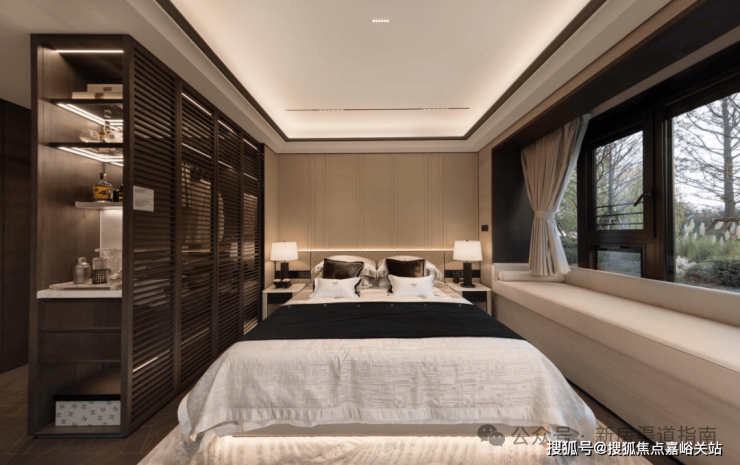 其中主卧的270°转角飘窗就有约5.7m²,通过与外立面的结合,直接做了梳妆台和储物柜,拓展了飘窗的实用性。