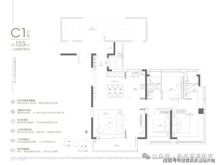 133㎡可以说是108㎡的进阶款,同样的三房两厅两卫,大面宽横厅、半开放式厨房设置岛台,加上主卧L型飘窗,再一次验证了华润置地豪宅化的产品思路。