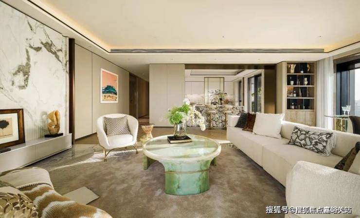 电视墙及玄关背景墙采用 意大利奢石芬迪白 ,独特的玉质感与流动纹理如山水画,而且保利贴心的提供了多款石材可供选择,将高定推向极致! 保利世博天悦售楼处电话:400-8894-986(官方24小时热线1-1在线预约)