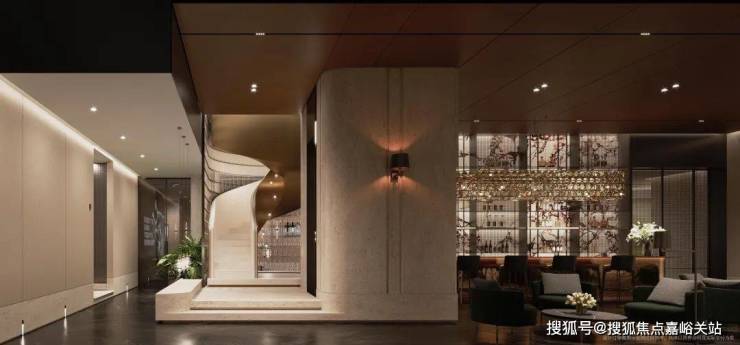 隐奢门庭:社区大门以 古琦黑奢石手工锻造弧形幕墙,将珠宝镶嵌工艺融入建筑肌理;
