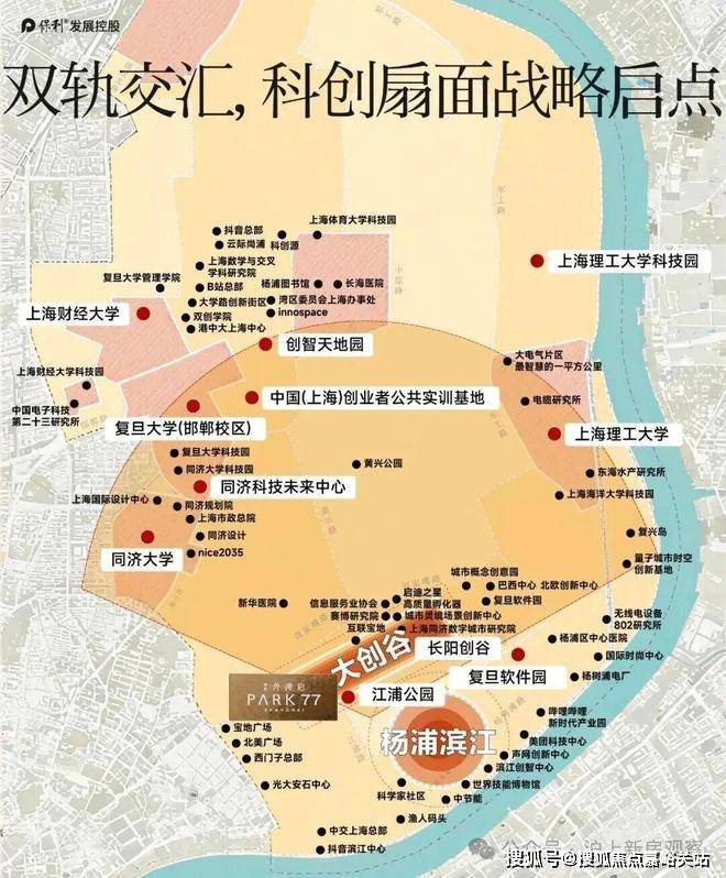 保利外滩启PARK77售楼处电话:400-8894-986VIPLINE热线最新发布的科创扇面,以5公里的创新半径,在杨浦滨江南段徐徐展开以江浦公园为支点,将“扇面”展开,上海最密集的高校智力资源汇聚于此北望4公里,百年复旦;向西3公里,同济巍然;东南5公里,上海理工;聚合高端人才、链动产城资源,创新杨浦