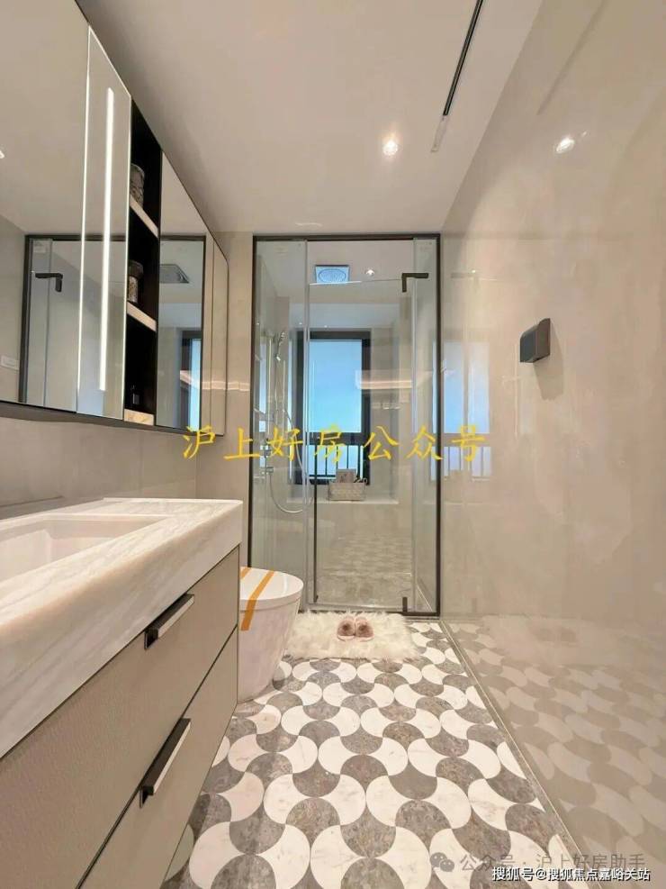 奢石台面,皮革饰面柜抽屉,侧端设置金属收纳开放格;定制镜柜,中间的透光玉石直接提升了高级感,镜柜内部配备了美妆冰箱+美妆灯条+轨道收纳!