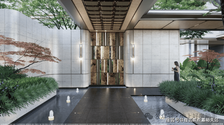 在门庭外,辅以两侧具有仪式感的跳泉水景,将建筑的圆弧美感与自然水景相合,共同构成海上·清和玺“贵雅清和”的城市界面。