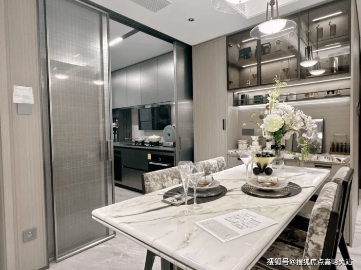 家的温情欢聚场:在餐厅区域,我们安置了一件餐边柜,其透光台面设计采用了雪山飞狐奢石材质,该餐边柜在收纳和储物功能上表现出色。