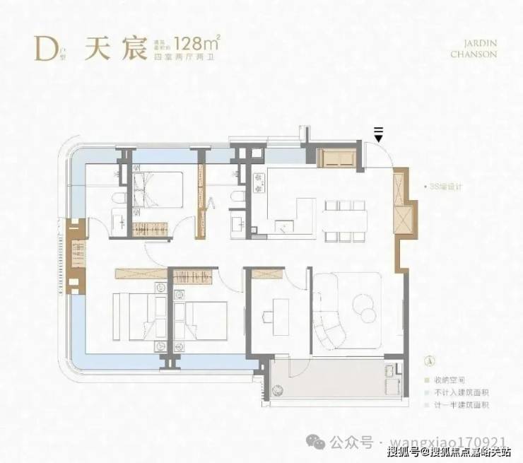 项目建面约128㎡4房户型 延续了前作3S墙的设计,保证了收纳空间的丰富性。
