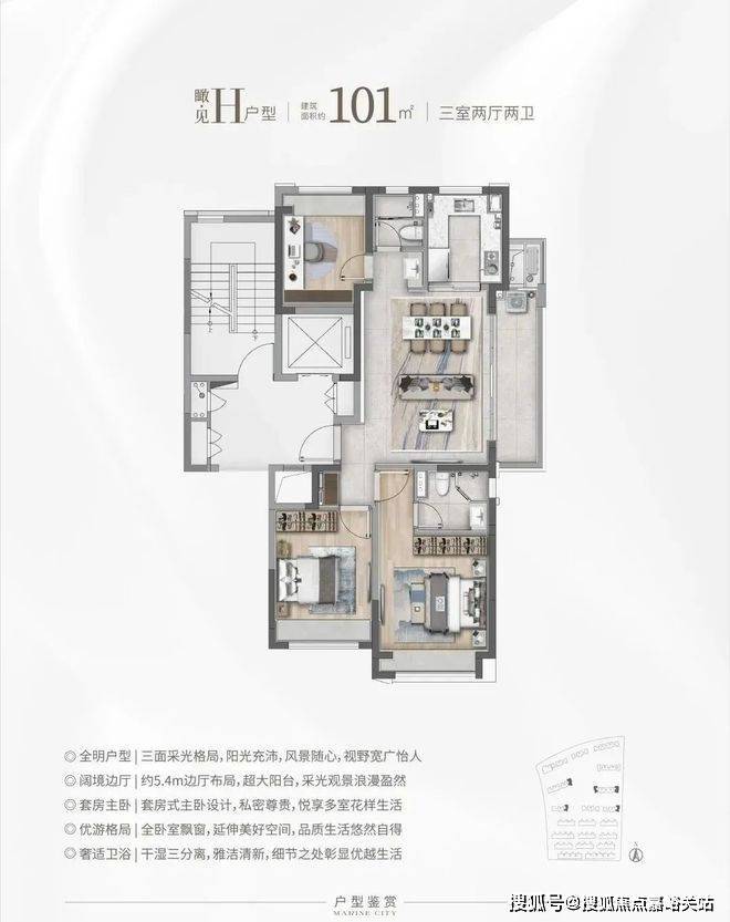 ③建面约101㎡H户型:三面采光,全能景观王炸边厅户型!同样是3房2卫的配置,功能性与舒适度兼具。该户型惊艳的地方在于 大尺度的景观边厅设计,搭配超大阳台,营造IMAX级别的客厅景观面,极具阔绰感! 全卧室飘窗、干湿三分离、U字型厨房设计,同样的魔鬼细节华发海上都荟售楼处电话☎:400-833-6309【已认证】