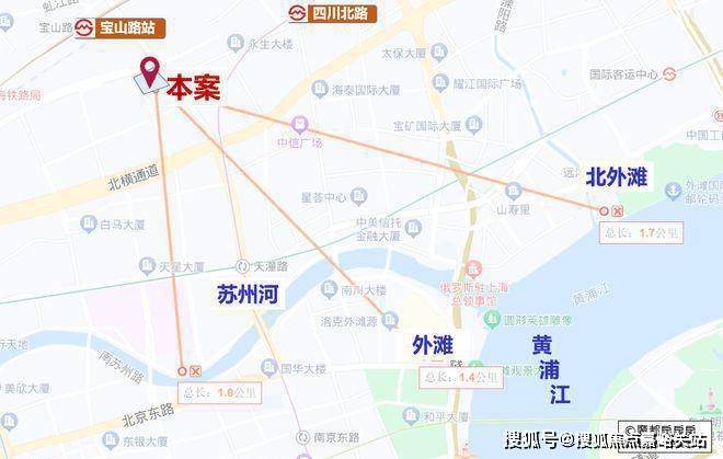 仅从图上看,该地块直线距苏州河约1公里,直线距外滩约1.4公里,直线距北外滩约1.7公里,直线距3/4号线宝山路站约300米,直线距10号线四川北路站约560米,区位优势明显。