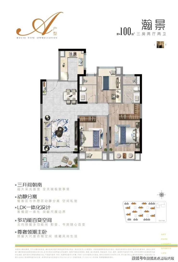 上实·望海项目在售建面约100㎡、120㎡、122㎡的高层3房户型,能够满足不同家庭结构和生活阶段的居住需求。其中,100㎡户型为3房2卫,三开间朝南、全卧室带飘窗、客厅带宽面阳台的设计,能让室内充满阳光,满足从二人世界到二胎生活的全生命周期需求。