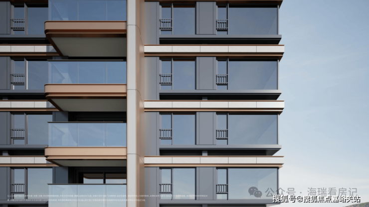 2、镜⾯美学:⼤窗墙⽐,打造宽屏⽴⾯:社区上,项目享四重酒店式归家