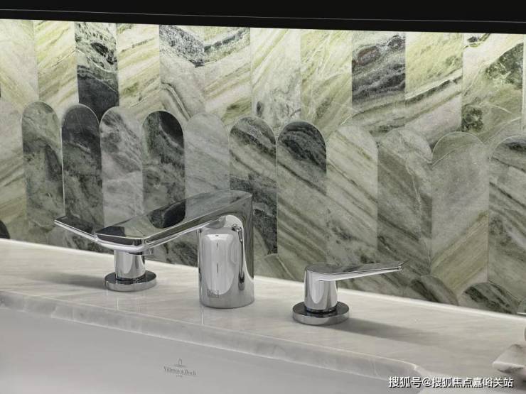 卫生间大量采用奢石和石材,比如主卫柜体墙面就是香格里拉翡翠拼花,龙头是冷热分离式,成本更高。☑️☑️中建壹品外滩源著售楼处电话:400-1183-605☑️☑️
