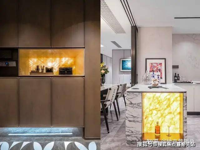 招商臻境的户内空间全面升级,这次我们主要看的是高层小户型,但也有各种天然奢石散布在室内的各个角落。入户玄关处,木材搭配凝脂发光石材,奢石包裹发光玉石壁龛。