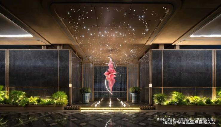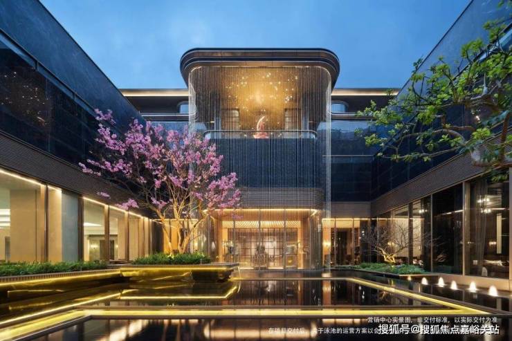 下沉式环幕庭院,跌水景观环绕,池底仿黑金砂与宝石晶片闪烁,点缀百余灯珠,师法“琉璃水光” 形意,糅合视听五感,打造全浸式立体园境,天工巧夺,嘉定未见。
