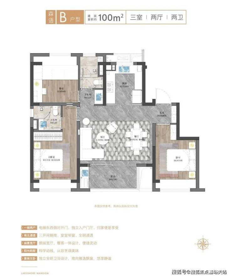 建面约100㎡三房,依旧是经典的飞机户型,大横厅设计,享受更阔绰的生活尺度,电梯对开门设计,配置独立电梯厅,拥有更多私享公共空间。