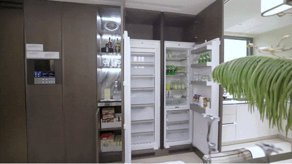 惊艳的当属那台 嘉格纳冰箱 , 嵌入式与墙体严丝合缝,德国精工美学与东方收纳智慧在此碰撞。