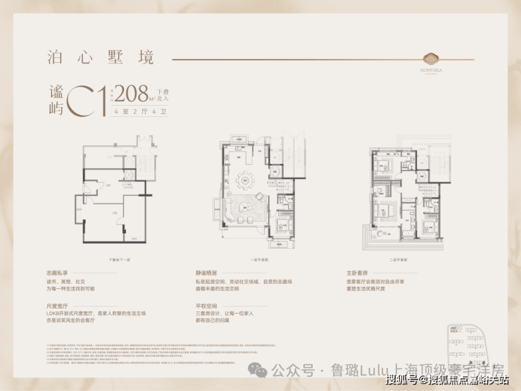 下叠户型,一楼 南向大横厅约9.3米的南向面宽,配合约3.3米的层高,营造出开阔的空间感;