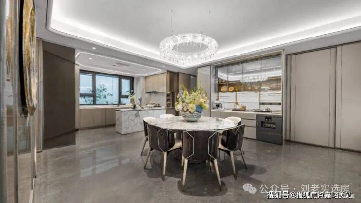 玄关、客餐联厅、厨房与阳台一体贯通,形成 建面约100㎡社交巨厅 ,可容纳10人大圆桌,聚合社交、筵席、娱乐等多元场景,尽享欢宴与聚会。