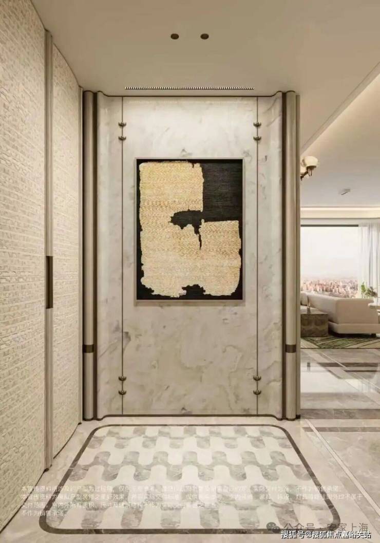 约2㎡玄关拼花采用 胜利拱券 × 全水刀工艺! 超高压切割让石材切口平整无崩边,结构更稳定,搭配天然石材的高硬度属性,长久使用依旧光洁如新,省去后期维护烦恼。