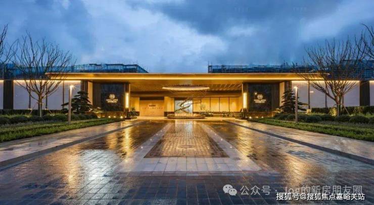 “绮丽门庭”酒店式社区入口,设环岛落客区,高定入户大堂,设飘顶弧形雨棚,顶部采用香槟金色的斜角造型吊顶,搭配手工打磨的璀璨星空顶及氛围灯,地面铺设仿石砖,墙面基调则借鉴了华尔道夫酒店的浅米黄色系大理石,并配以精致的礼仪灯设计。