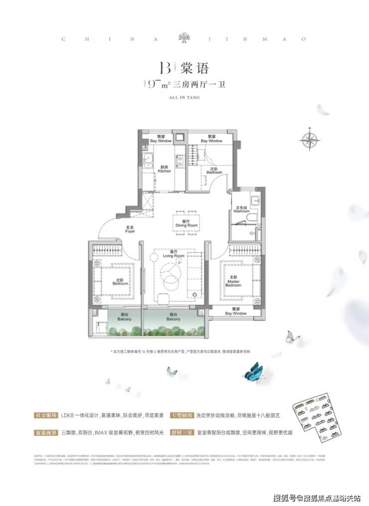 建面约97㎡3房2厅1卫 ,户型 三开间朝南、再加上“3个飘窗+双面阳台系统” ,不管是采光、视野、通风、私密性,还是实用性都十分出色。