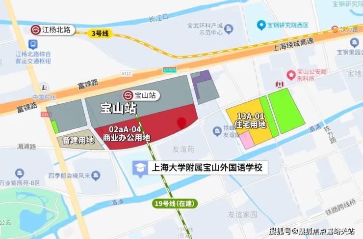 项目地处宝山杨行板块,是19号线宝山站(在建)TOD综合体地块。地块用途为商业、住宅、办公、餐饮旅馆混合,其中13A-01为住宅,容积率2.3, 装修标准2500元/㎡。